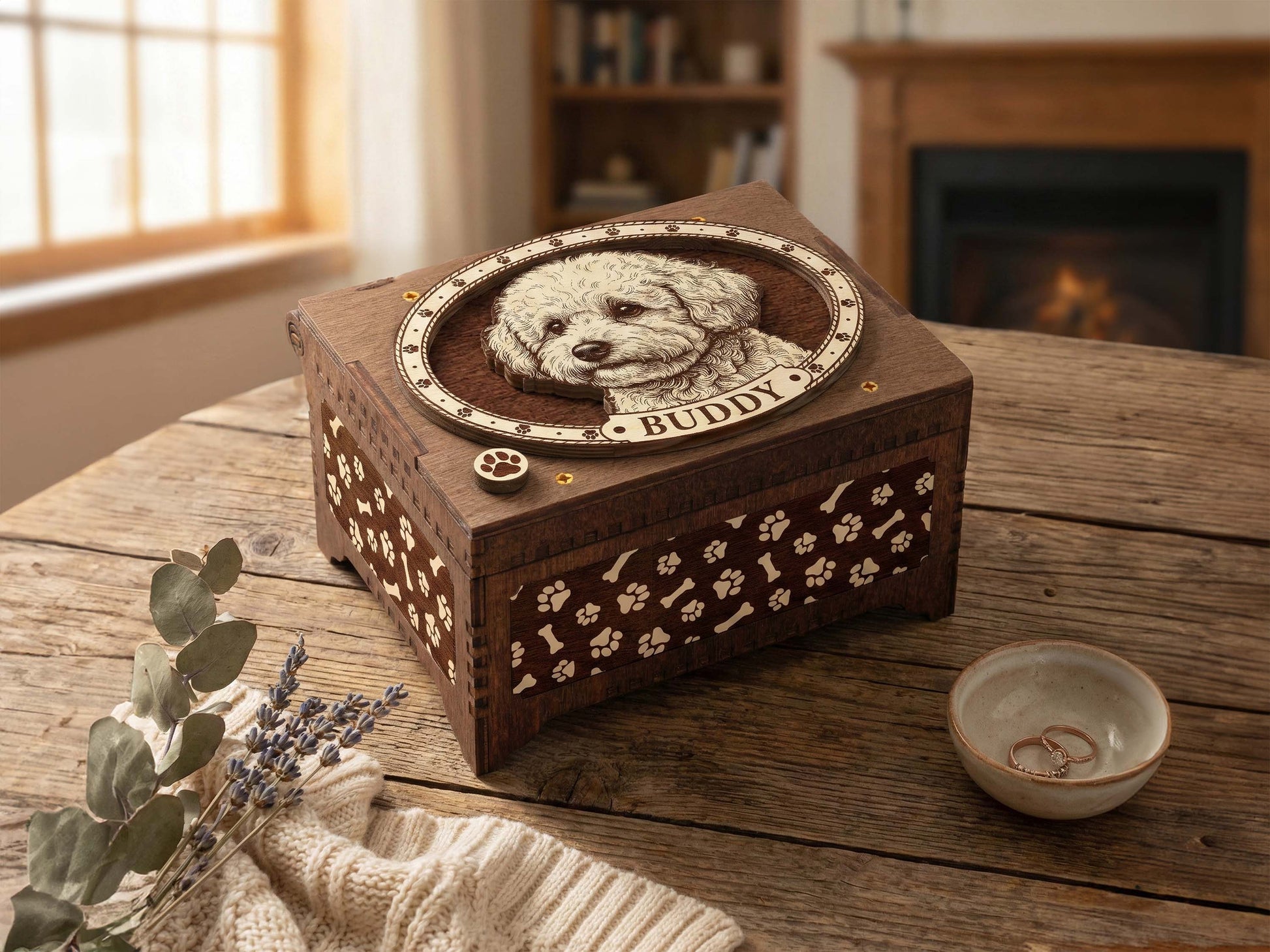 Honor your dog with this handcrafted Bichon Frise dog music box. Designed as a timeless tribute to the loyal dog in your life, this box serves as a sacred space for your most cherished memories. Whether you are looking for a sympathy gift for a grieving friend or a personal way to remember your own companion, this box offers comfort and connection.
