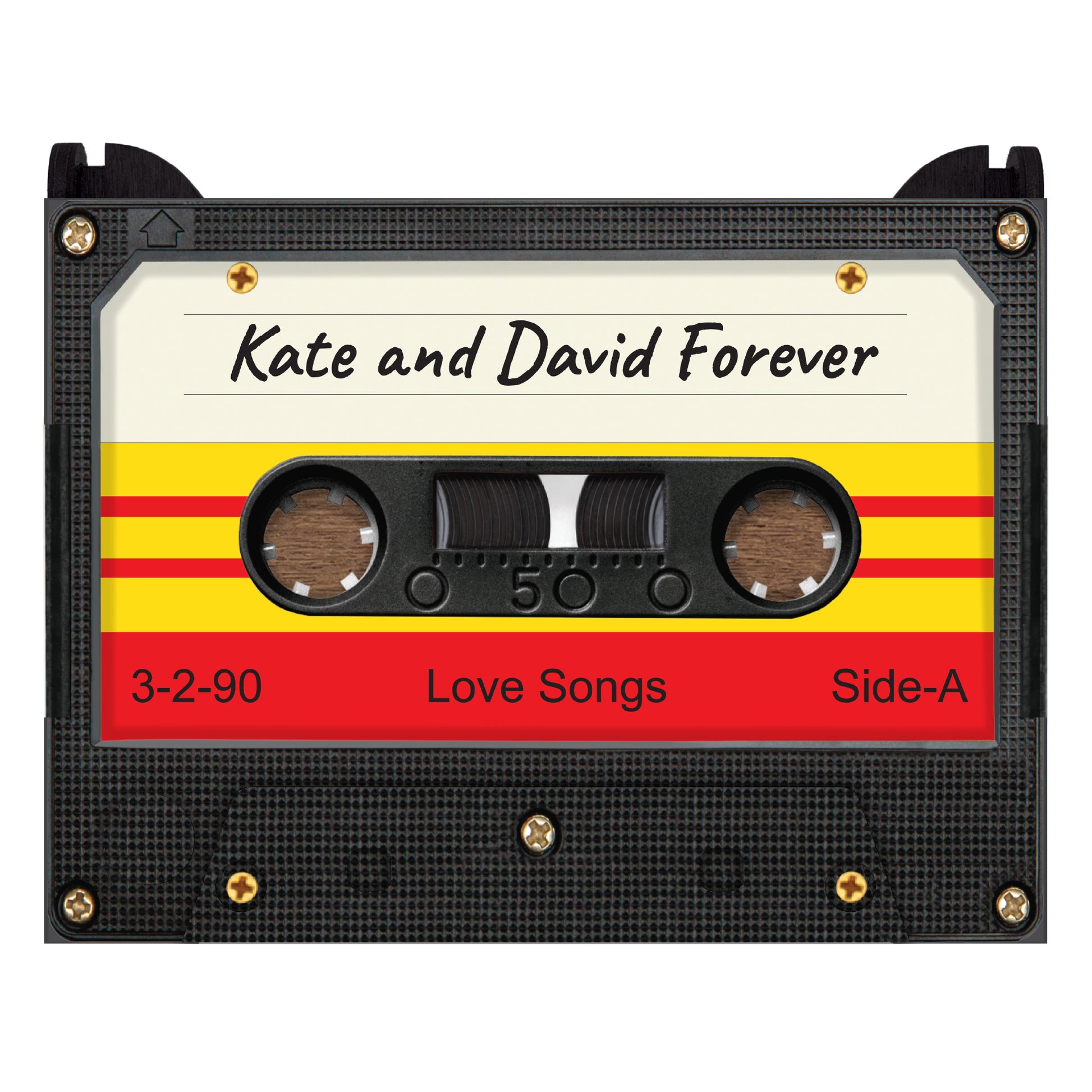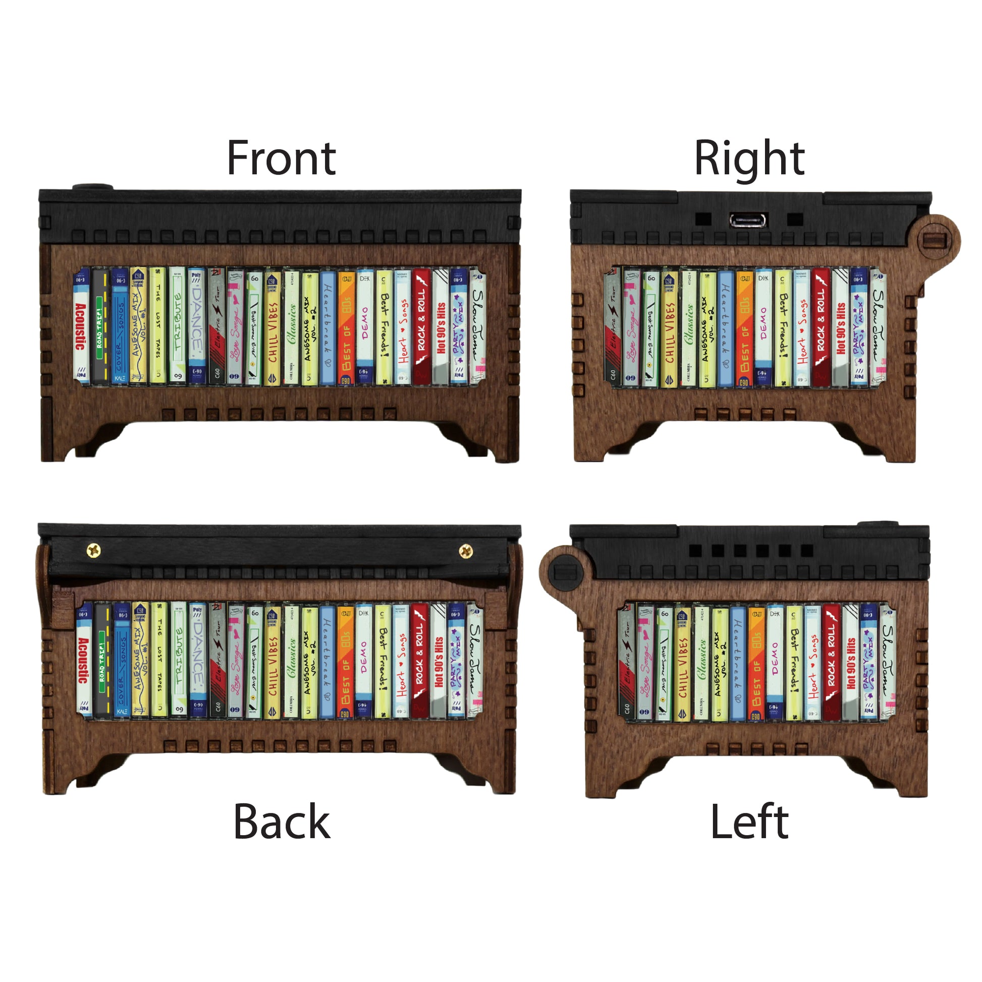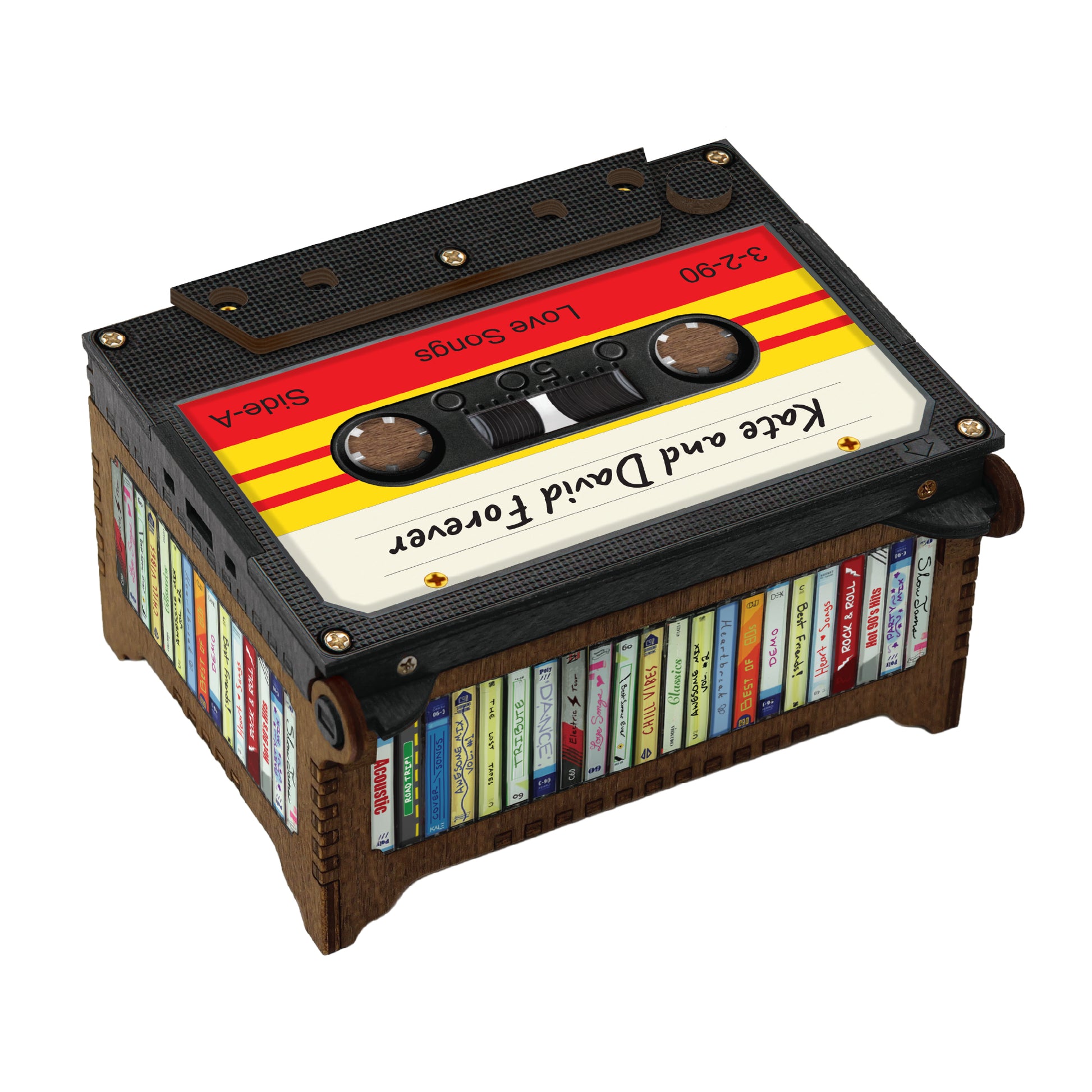 This retro cassette tape music box will play your favorite song. Because it is recorded digitally, literally any audio (including voice) can be used. If you prefer a traditional music box sound, there are many song versions online to choose from. Pressing the play button on the lid of the box starts and stops the song.