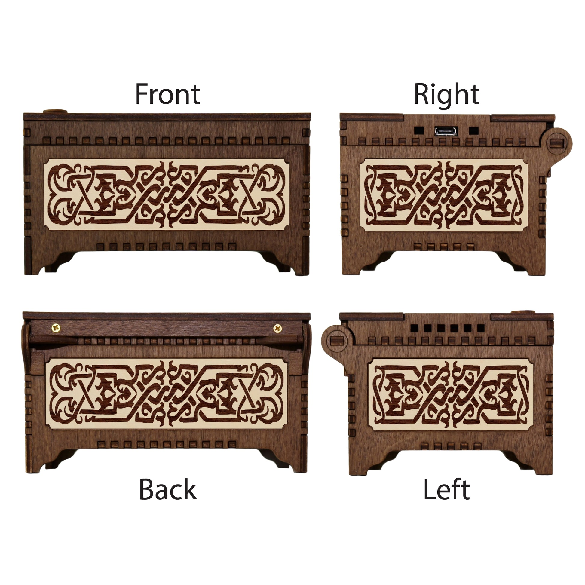 This tree of life digital audio music box will play your favorite song. Because it is recorded digitally, literally any audio (including voice) can be used. If you prefer a traditional music box sound, there are many online that I can record. Pressing the play button on the lid of the box starts and stops the song.