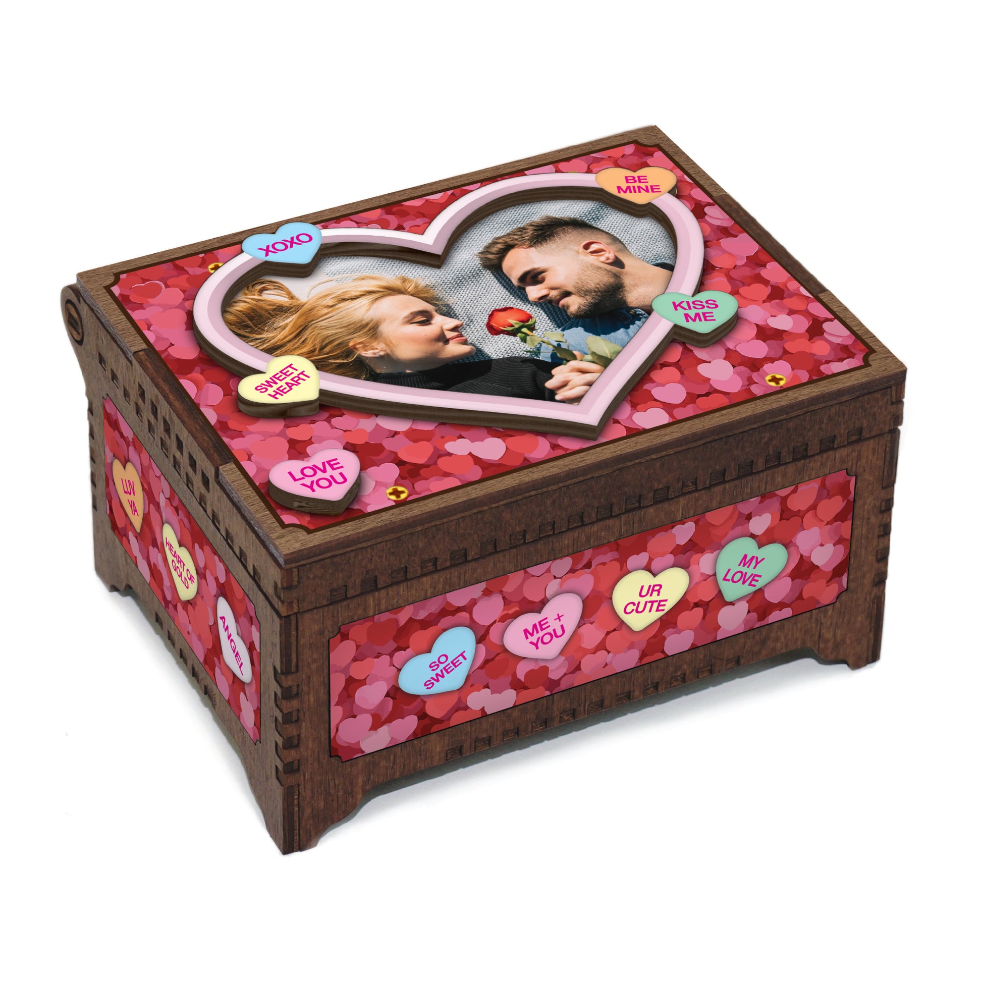 Impress your sweetheart with a romantic conversation hearts music box! It's the ultimate romantic gift. The music box can play a song that holds meaning for you and your partner, a recording of your own voice professing your love, or any other audio that captures the essence of your relationship. Customize the top with your photo printed within the heart frame. Personalize the inside with a heartfelt message to your love, or use a photo and text to remember a special moment! A perfect gift for Valentine's Day or anytime you want to share a heartfelt gift.
