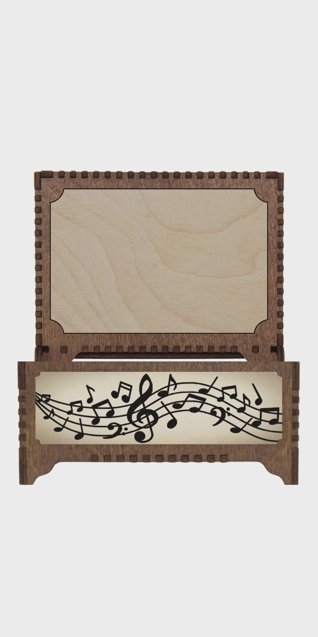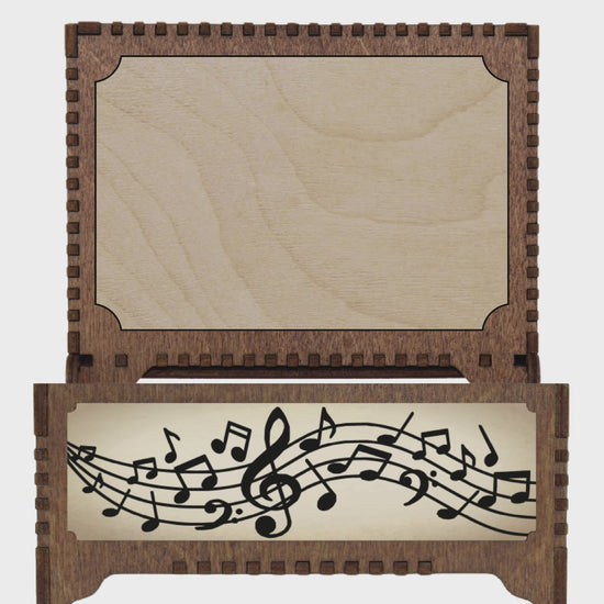 This digital audio music box will play your favorite song. Because it is recorded digitally, literally any audio (including voice) can be used. If you prefer a traditional music box sound, there are many online that I can record. Pressing the play button on the lid of the box starts and stops the song.
