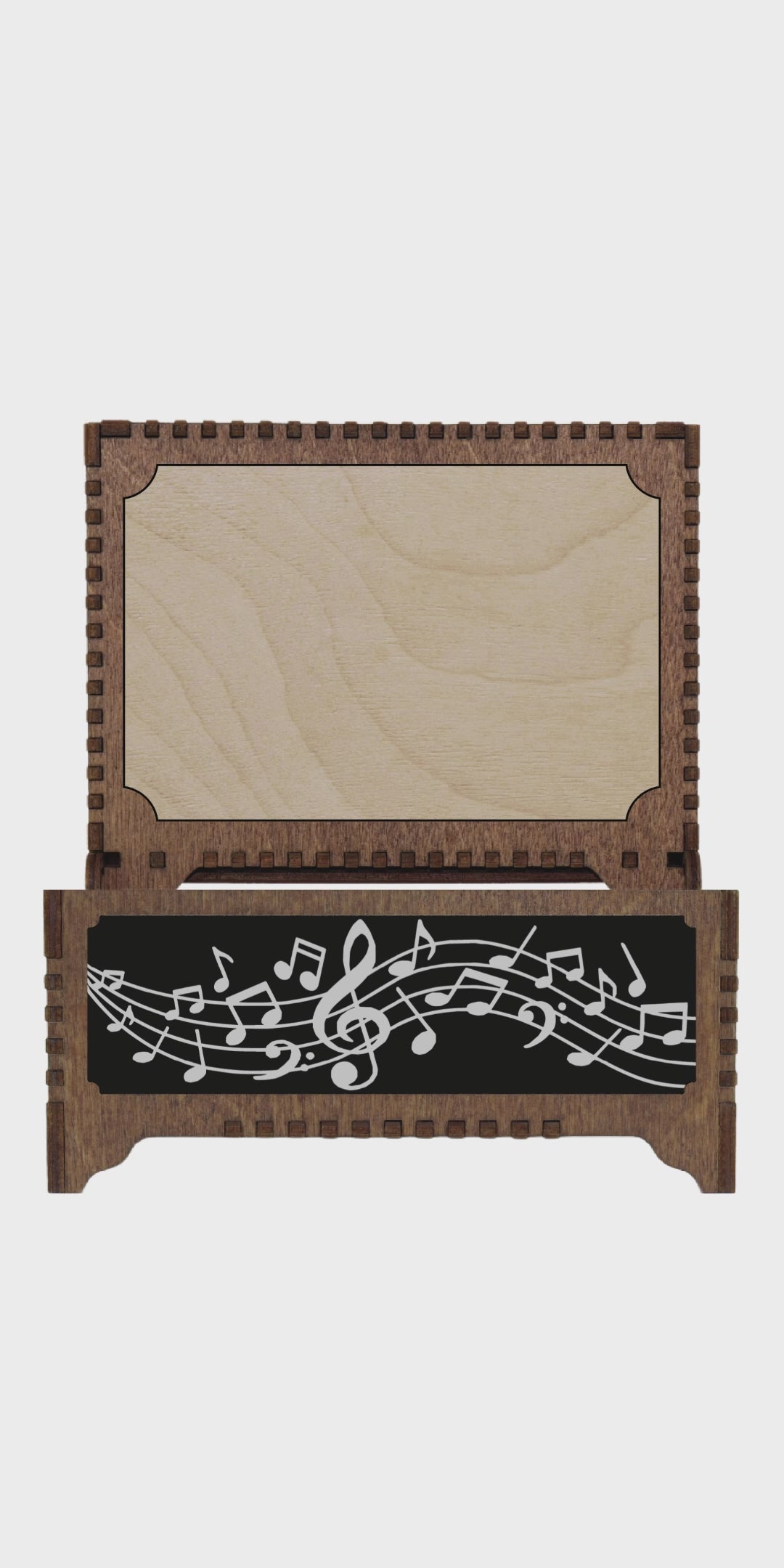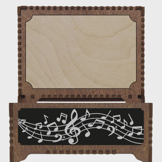 This digital audio music box will play your favorite song. Because it is recorded digitally, literally any audio (including voice) can be used. If you prefer a traditional music box sound, there are many online that I can record. Pressing the play button on the lid of the box starts and stops the song.