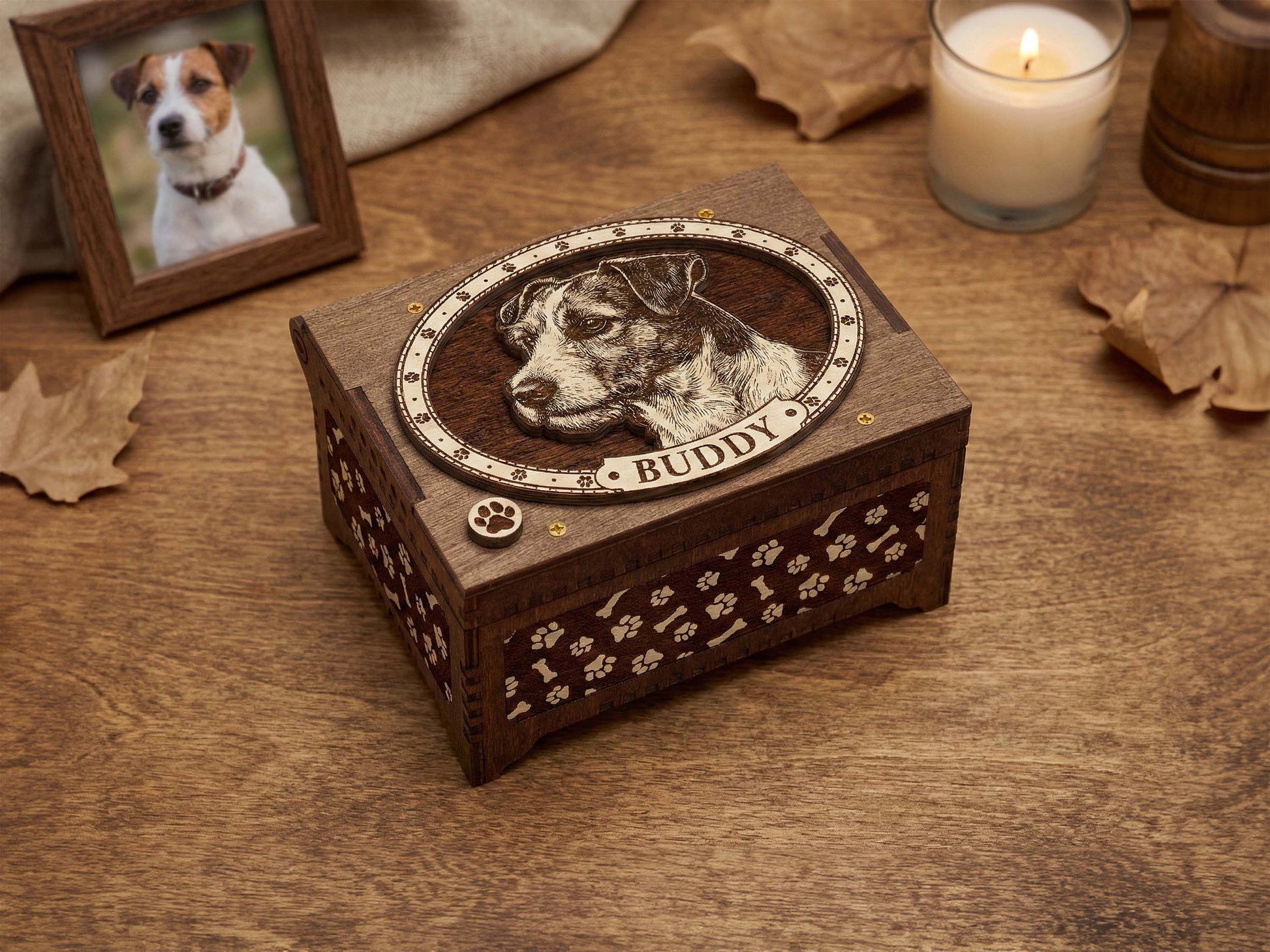 Honor your dog with this handcrafted Russell Terrier music box. Designed as a timeless tribute to the loyal dog in your life, this box serves as a sacred space for your most cherished memories. Whether you are looking for a sympathy gift for a grieving friend or a personal way to remember your own companion, this box offers comfort and connection.