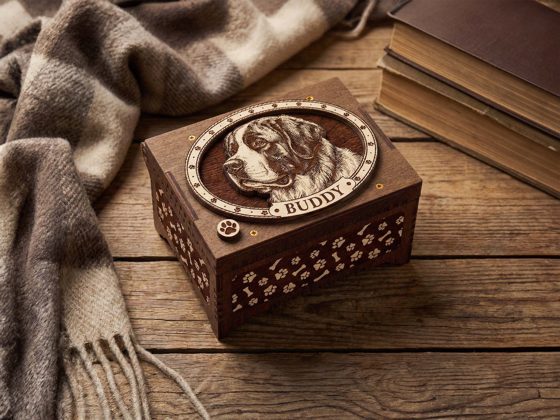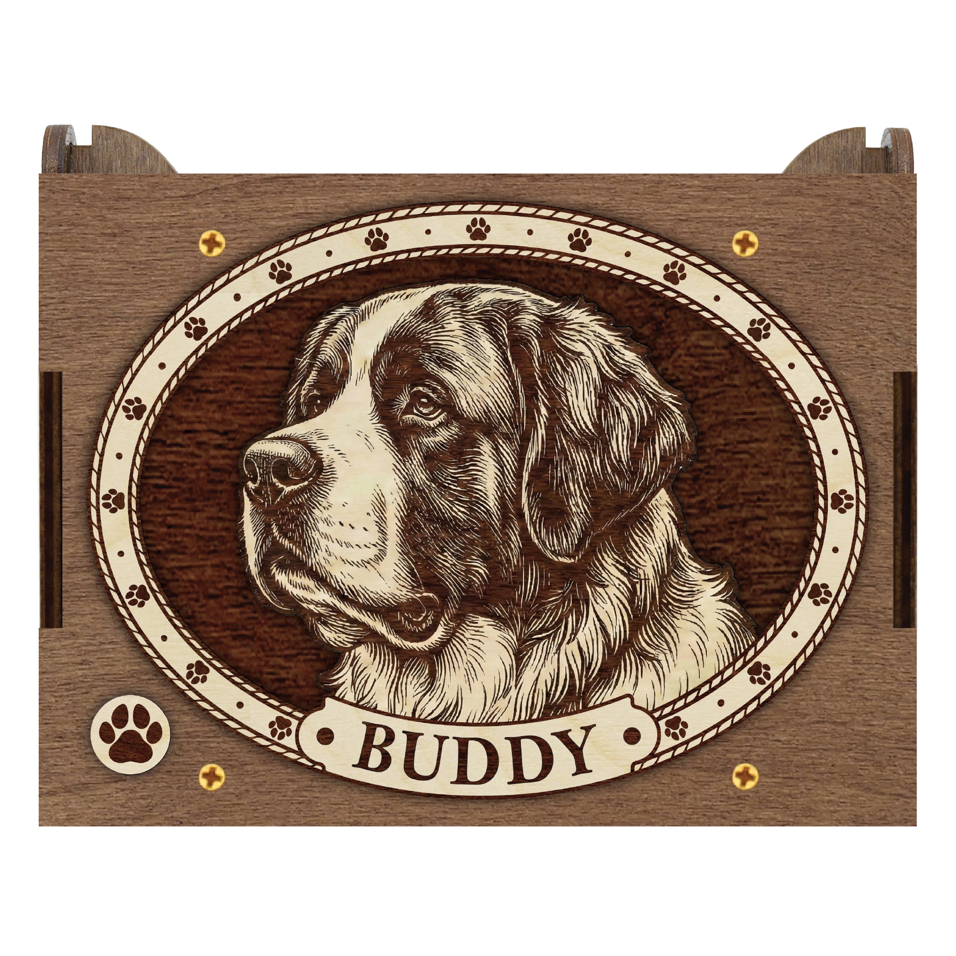 Honor your dog with this handcrafted Saint Bernard dog music box. Designed as a timeless tribute to the loyal dog in your life, this box serves as a sacred space for your most cherished memories. Whether you are looking for a sympathy gift for a grieving friend or a personal way to remember your own companion, this box offers comfort and connection.
