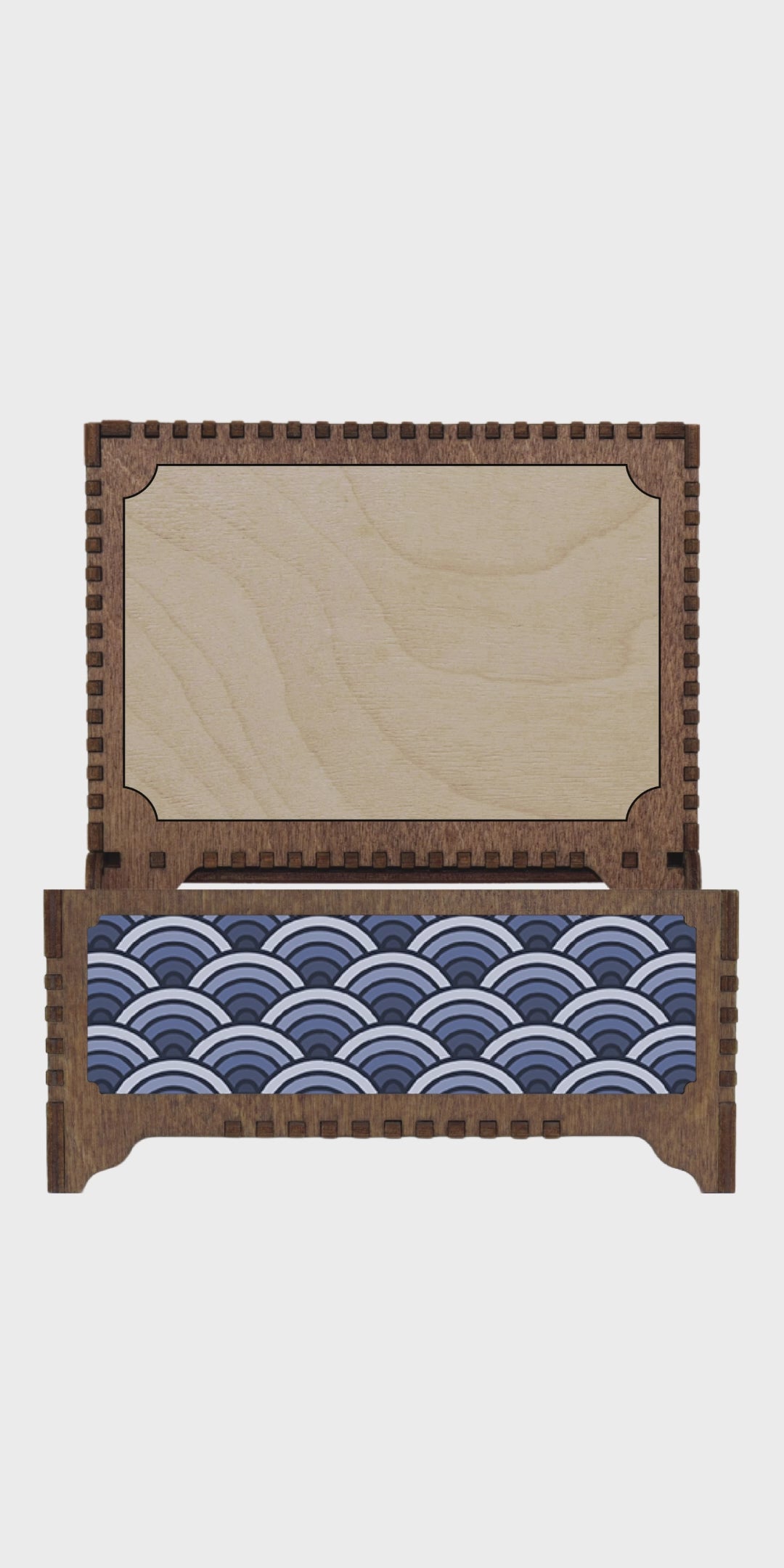This custom music box is based on Hokusai's painting The Great Wave off Kanagawa. It can be personalized inside with your own wording and a photo, and recorded with any audio. Because it is recorded digitally, literally any audio (including voice) can be used. If you prefer a traditional music box sound, there are many song versions online to choose from. Pressing the play button on the lid of the box starts and stops the song.
